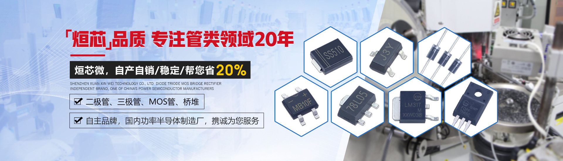 深圳市烜芯微科技有限公司是一家集研發(fā)、生產(chǎn)、銷售于一體,專注于二極管、三極管,MOS管、橋堆等功率半導(dǎo)體領(lǐng)域發(fā)展的企業(yè)。采用國(guó)際領(lǐng)先的GPP芯片生產(chǎn)工藝及一心多Die高精密制造工藝,擁有功率半導(dǎo)體器件工程實(shí)驗(yàn)室,全自動(dòng)高精密生產(chǎn)設(shè)備,產(chǎn)品層層把控,全程可追溯,保障了每只產(chǎn)品的卓越品質(zhì)。 產(chǎn)品封裝包括SMA,SMAF,SMB,SMBF,SMC,SOD-123,SOD-123FL,SOD-323,SOD-323FL,SOD-523,SOD-723,SOT-23,SOT-89,SOT23-3L,SOT23-5L,SOT23-6L,SOT-223,SOT-523,SOT-723,DO-41,DO-15,DO-27,DO-35,R-1,R-6,LL-34,LL-41,TO-277,TO-92,TO-92S,TO-92L,TO-126,TO-251,TO-252,TO-262,TO-263,TO-220,TO-220F,TO-247,TO-3P,TO-264,MBS,MBF,MBM,ABS,UMB,UMSB,DB,DBS,D3K,KBP,GBP,GBU,GBL,GBJ,KBL,KBU,KBJ,KBPC,KBPC6,KBPC8,KBPC-W,DNF,TSSOP-8,TSSOP-16,SOP-4,SOP-6,SOP-8,SOP-10,SOP-14,SOP-16,DIP-4,DIP-6,DIP-8,DIP-10,DIP-14,DIP-16,月產(chǎn)各封裝達(dá)6億只。 公司通過(guò)了ISO14001環(huán)境管理體系認(rèn)證,產(chǎn)品均獲得了ISO9001質(zhì)量體系認(rèn)證、UL、SGS等認(rèn)證,符合歐盟最新RoHs指令。擁有和致力于烜芯微/XXW自主品牌產(chǎn)品的推廣,提供技術(shù)支持,選型替換,cost down方案及擁有專業(yè)的生產(chǎn)管理團(tuán)隊(duì)和銷售團(tuán)隊(duì),保證了供貨穩(wěn)定及售前選型服務(wù)等問(wèn)題。 公司產(chǎn)品廣泛應(yīng)用于開(kāi)關(guān)電源、適配器、逆變器、控制器、汽車電子、家用電器、通訊設(shè)備、無(wú)線充、鋰電池保護(hù)板、驅(qū)動(dòng)電機(jī)、安防警報(bào)、太陽(yáng)能光伏產(chǎn)業(yè)等多個(gè)領(lǐng)域。取得了國(guó)內(nèi)外眾多品牌大廠的認(rèn)可與合作,我們將堅(jiān)持奉行“烜芯品質(zhì),誠(chéng)信經(jīng)營(yíng),合作共贏”為公司經(jīng)營(yíng)理念!竭誠(chéng)為新老客戶提供優(yōu)質(zhì)的產(chǎn)品及服務(wù)。